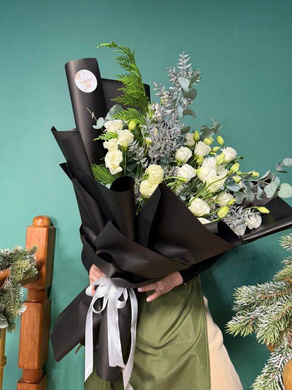 Преимущества: Нужна была нежная композиция - девушка любит белые розы, но хотелось какого-то разнообразия. К обычным розам добавили кустовую и эвкалипт и завернули в красивую бумагу. Это то, что нужно, спасибо